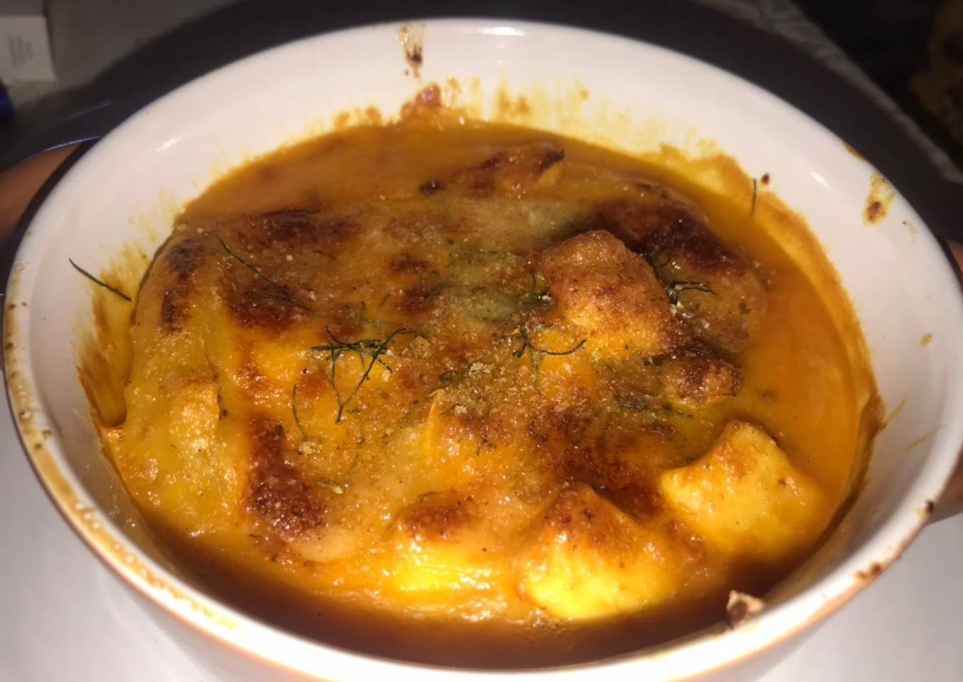 - Colocar el filete dentro de la cazuela, verter el calamar encima, cubrir con el resto de salsa, espolvorear con el eneldo y el parmesano