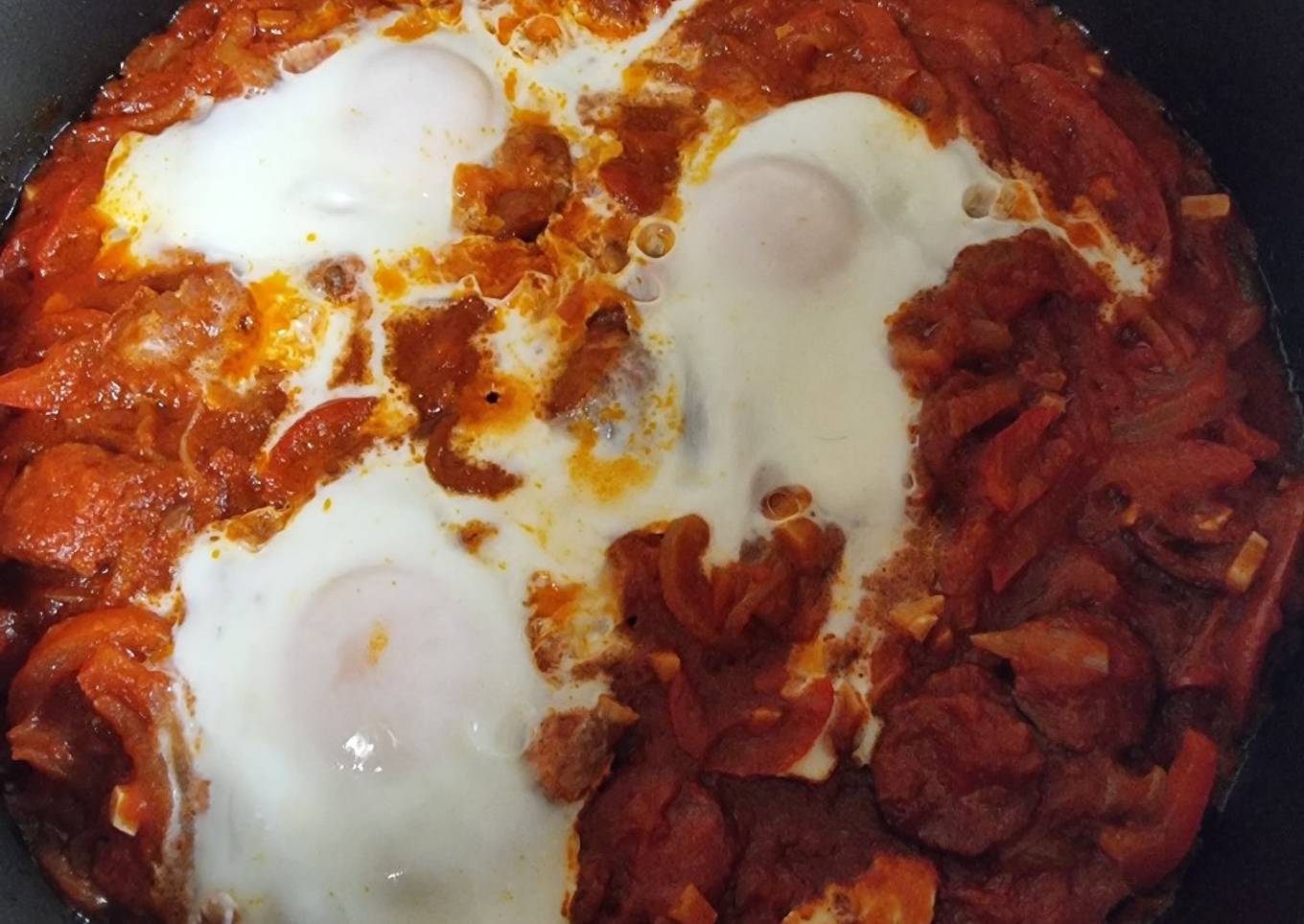 El shakshuka es un plato de la comida de Oriente Medio y del Gastronomía magrebí realizado a base de huevos escalfados en salsa de tomates, pimientos y cebolla, comúnmente aderezado con comino, pimentón y harissa.